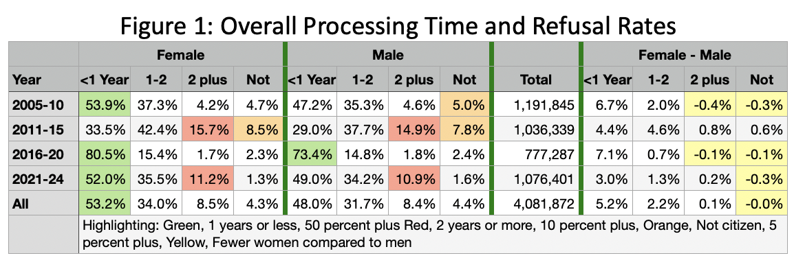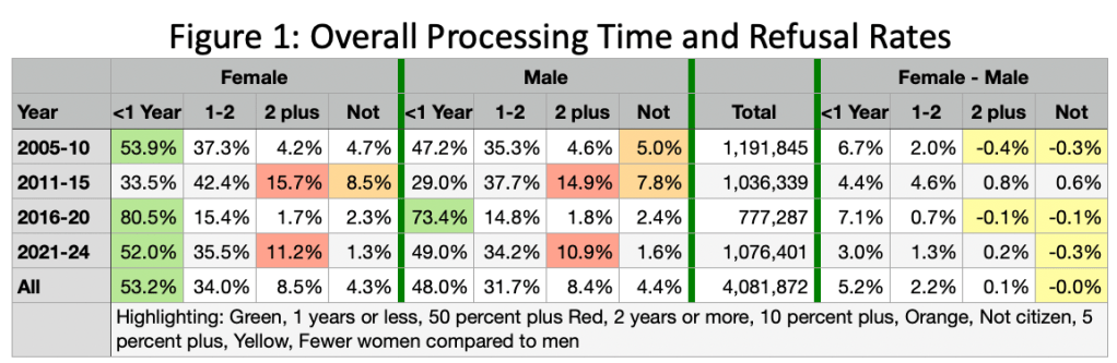 Figure 1 provides the overview by period highlighting that in general, women applicants were granted citizenship faster than men and had higher approval rages, save for the 2011-15 period. The percentage not granted citizenship rose to over ten percent in 2012 and 2013, before recovering to just over seven percent in the last years of the Conservative government. Moreover, only about 20 percent of applications were processed within the service standard of one year 2010-13. Apart from the pandemic years 2021-22, service standards were met close to 80 percent of the time.