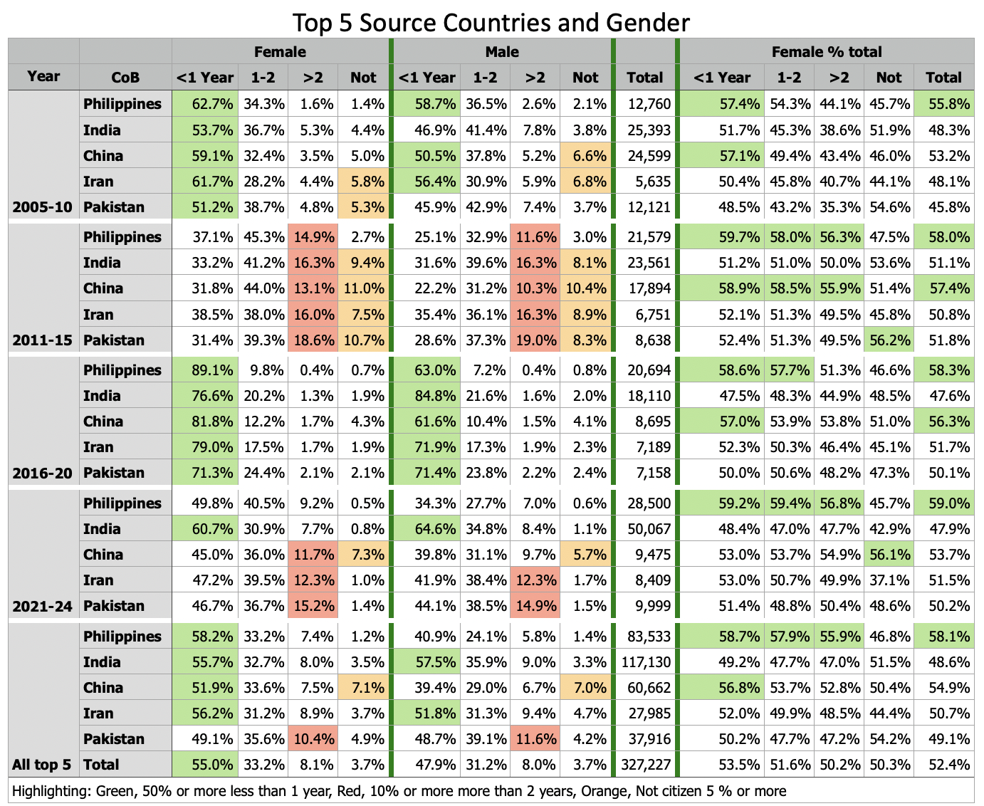 Application data by gender, immigration category or country of birth highlights the dramatic initial impact of the policy changes of the Conservative government and how these were relaxed by the Conservatives themselves before having virtually no impact after a number of years under the Liberals. The same pattern applies no matter what the variable, the 2011-15 period was the worst period in terms of delays and approval rates.