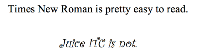 This experiment is a compelling argument against using silly fonts (I’m looking at you, Comic Sans). Presenting text in a hard to read font is an established way of reducing fluency. The unedited version of the highest quality essay from the first experiment was given to 51 participants in one of two fonts: italicized “Juice ITC” or normal “Times New Roman.” See below for a comparison: